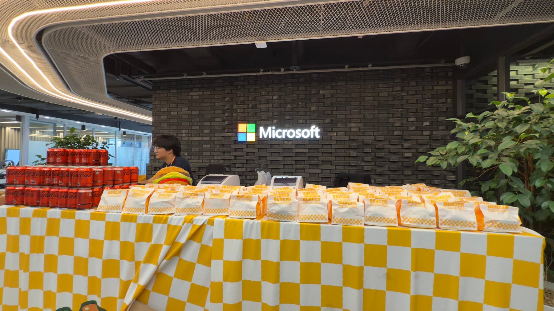 올해는 점심식사로 크라이치즈버거와의 협업을 통해 치즈버거와 음료를 제공할 수 있었습니다. 또, 지난해와 같이 한국마이크로소프트측에서 도와주신 덕에 12층에서 식사를 제공할 수 있었습니다.