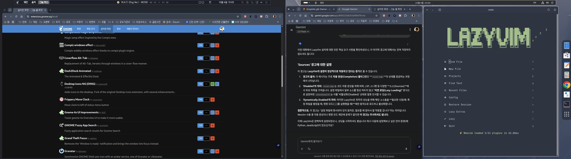 화면의 좌측은 그놈 박스에서 돌리는 페도라 42 워크스테이션입니다. Lazy.vim 설치해서 사용중입니다. 좋더군요. 그동안의 삽질이 무색하게 한번에 모든 환경이 갖춰 집니다. 좋네요.