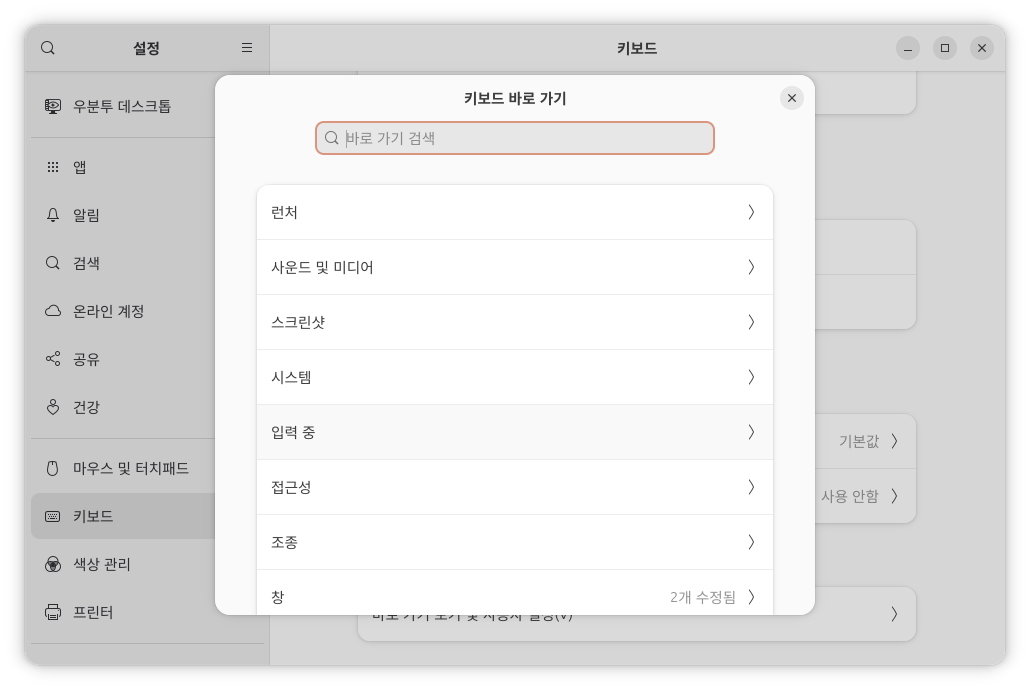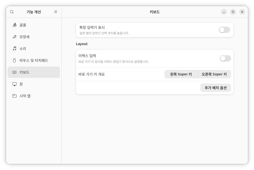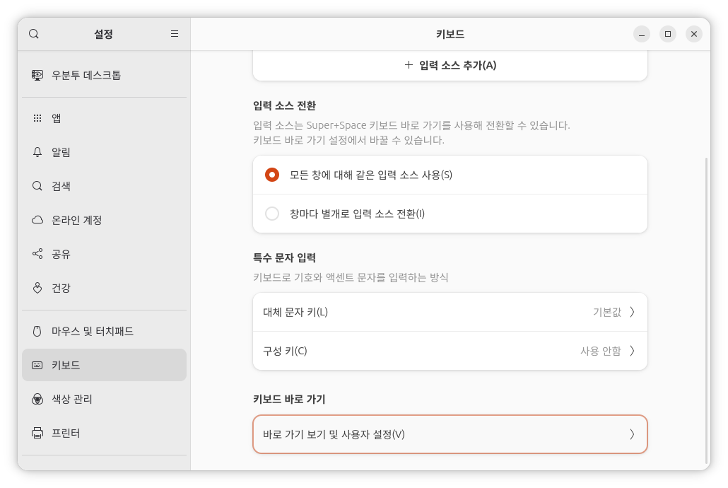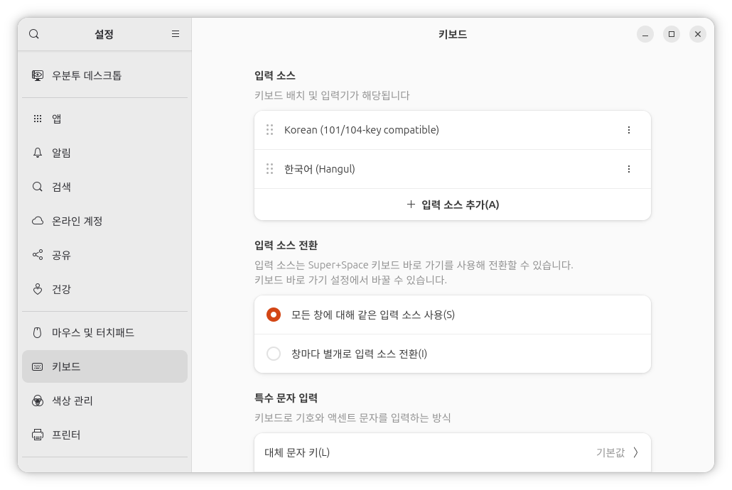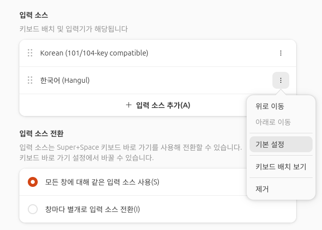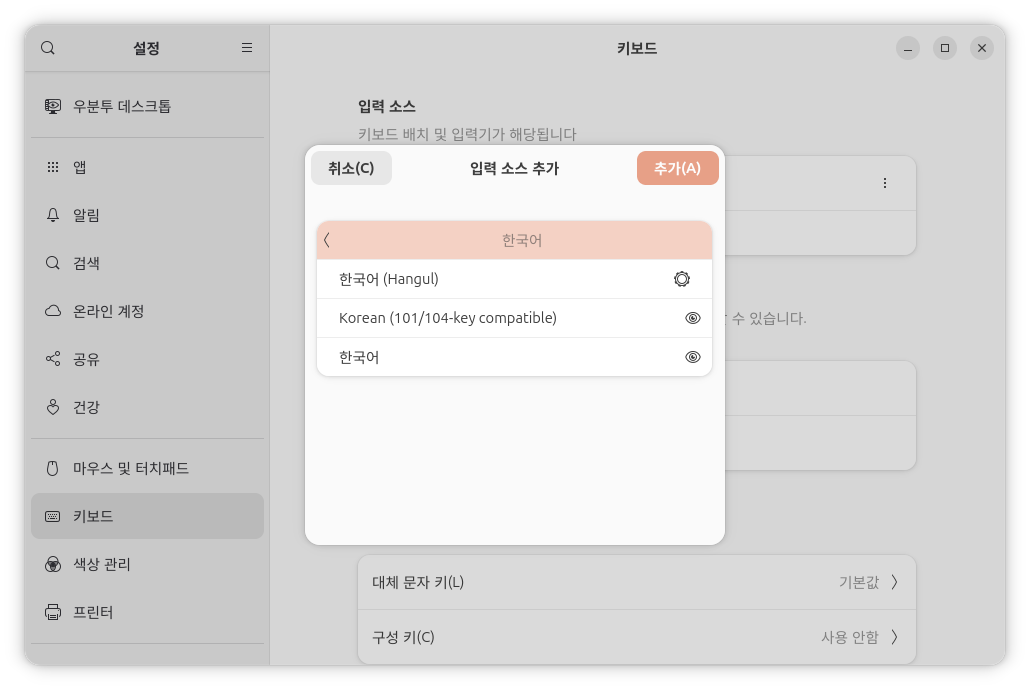 설정 앱을 열고, 키보드 메뉴로 이동하면 입력 소스 에서 사용하고자 하는 키보드 레이아웃이나 입력기(IME)를 설정할 수 있습니다. 우분투 데스크톱 설치 진행 시, 언어를 한국어로 선택하여 설치 하였다면, 아래 사진처럼 한국어 (101/104 호환) 배열과 한국어(Hangul)입력기 이렇게 두가지가 설정되어 있을 것입니다.