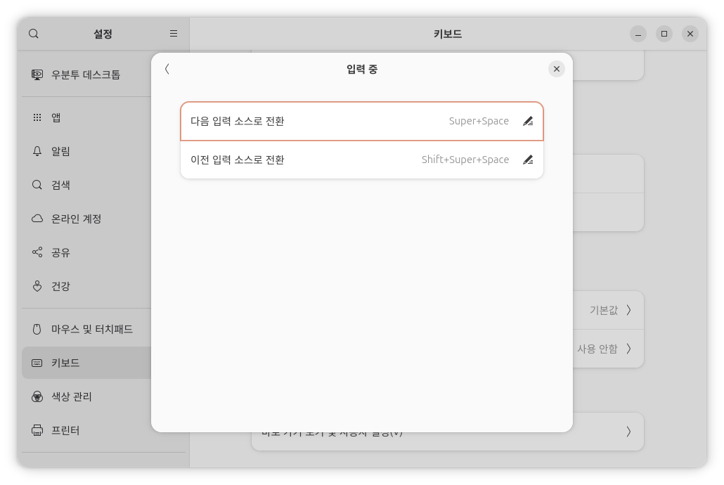 여기서 입력 중 으로 들어가면, 다음 입력 소스로 전환, 이전 입력 소스로 전환에서 단축키를 설정하여 이용하실 수 있습니다.