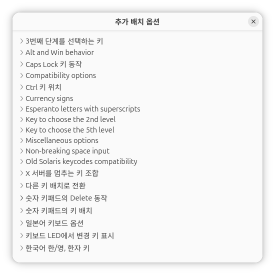 다른 언어도 입력을 하려는 경우, 예를 들어 한국어, 영어, 중국어 3가지 입력이 필요하다면, 단축키로 한국어 → 영어 → 중국어 순서대로 전환하며 사용할 수 있습니다. 이런 경우, ibus-hangul 등 각 언어별 입력기에서 제공하는 한영전환키 등 언어 전환 단축키 설정은 제거하고, iBus 에서 제공하는 입력 소스 전환 단축키를 설정하는 것이 더 편할 것입니다.