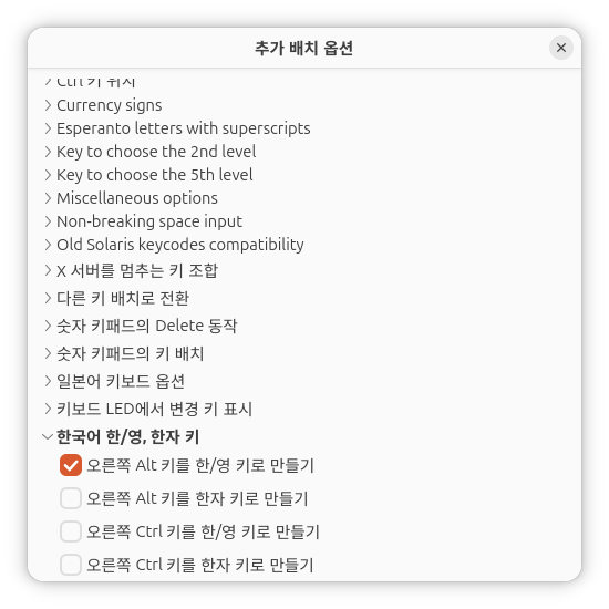 여기서, 원하시는 설정을 활성화 하여서 오른쪽 Alt 키 혹은 Crtl 키를 한/영 키나 한자키에 매핑하여 사용하실 수 있습니다.