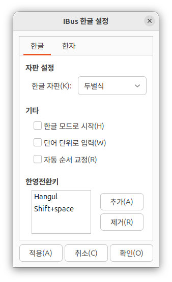 여기에서 한영전환키 메뉴에서 단축키를 설정하여, ibus-hangul 만으로 한국어 및 영어를 전환하면서 이용할 수 있습니다.