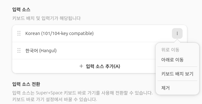 Korean (101/104-key Compatible)은 단순이 국내에서 사용하는 101/104 호환 키보드 배열 구성이여서, 한/영 전환 키 등을 지원하긴 하지만 실제로 한국어 입력을 가능하게 하지는 않습니다. 아래 사진처럼 항목 우측의 3점 버튼을 통해 입력 소스에서 제거할 수 있습니다.