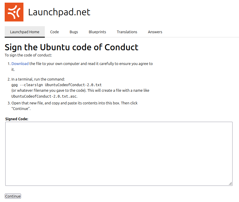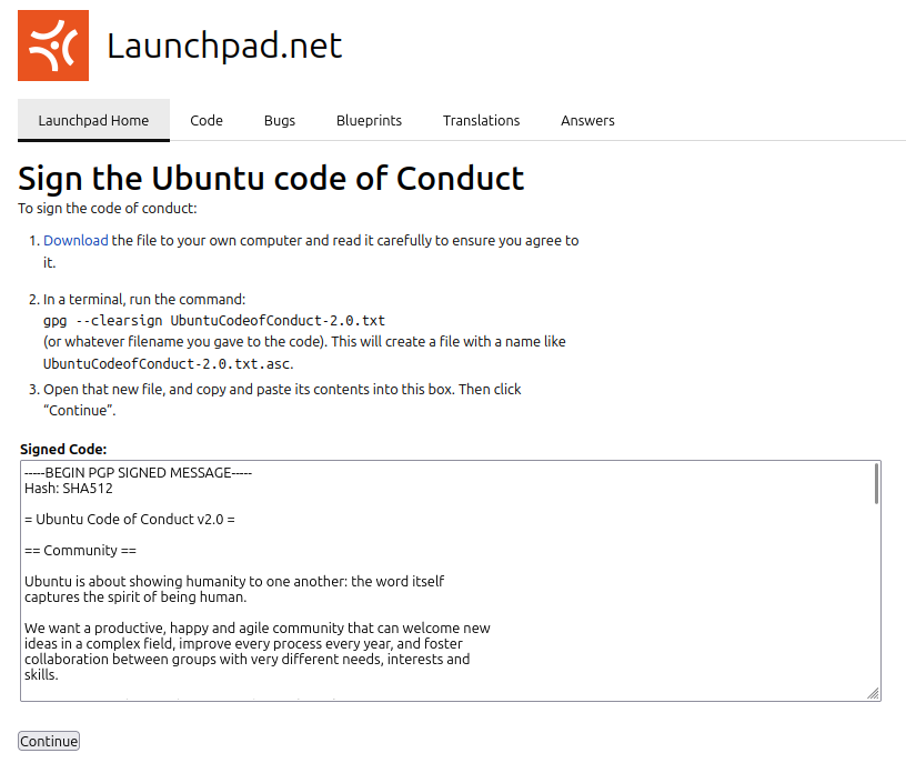 아래와 같은 화면이 나옵니다. 앞서 서명을 통해 생성된 UbuntuCodeofConduct-2.0.txt.asc 파일의 내용을 붙여 넣고 Continue 를 누르면 완료 됩니다.