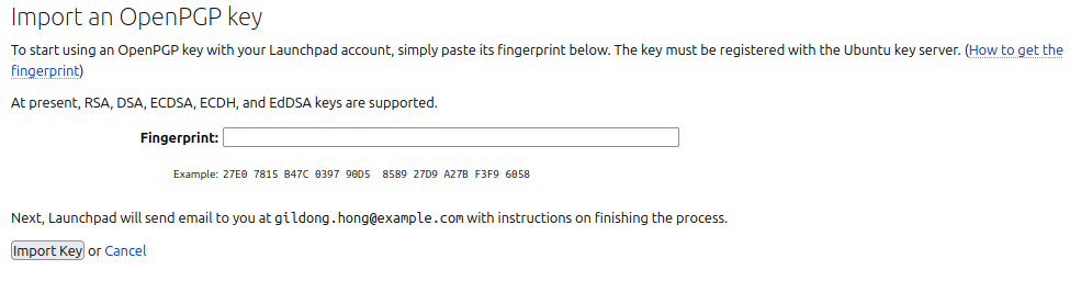 Import an OpenPGP key 부분에, 앞서 Ubuntu Keyserver 에 올린 OpenPGP 키의 핑거프린트를 입력하고 Import Key버튼을 눌러서, 키 불러오기 절차를 진행 합니다.