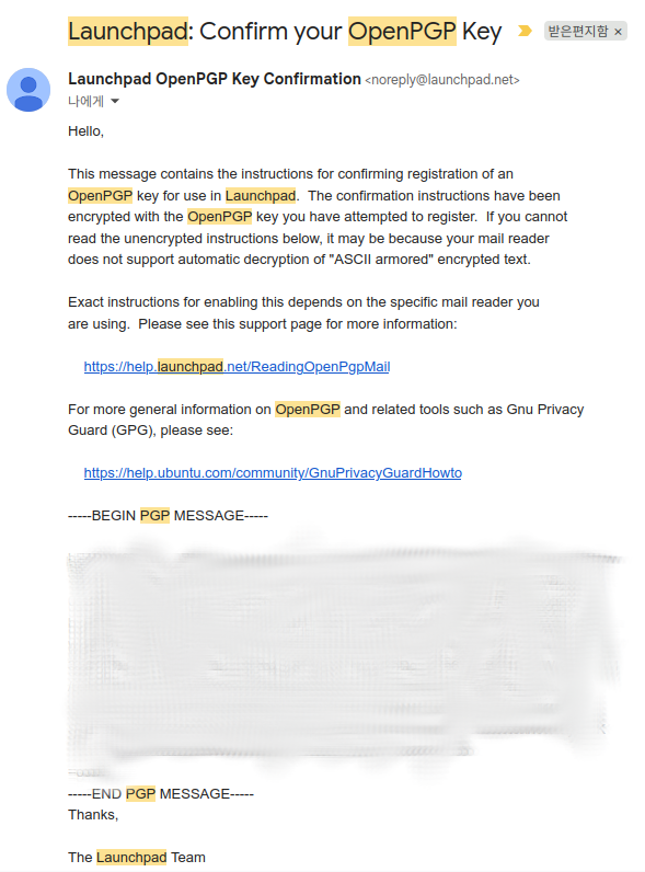 그러면 위와 같이 OpenPGP Key 불러오기 확인을 위한 이메일을 받을 수 있습니다. 이메일 본문에서 -----BEGIN PGP MESSAGE----- 부터 -----END PGP MESSAGE----- 까지 암호화된 부분을 선택하여 별도의 텍스트 파일로 저장 합니다.