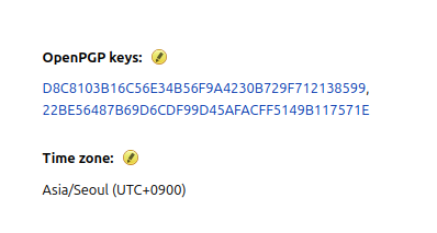 OpenPGP keys: 옆에 연필 버튼을 누르면, 본인 Launchpad 에 등록한 OpenPGP 키 관리 화면이 나옵니다. 찾지 못하였다면, 여기를 클릭하여 동일한 페이지에 접속 가능합니다.