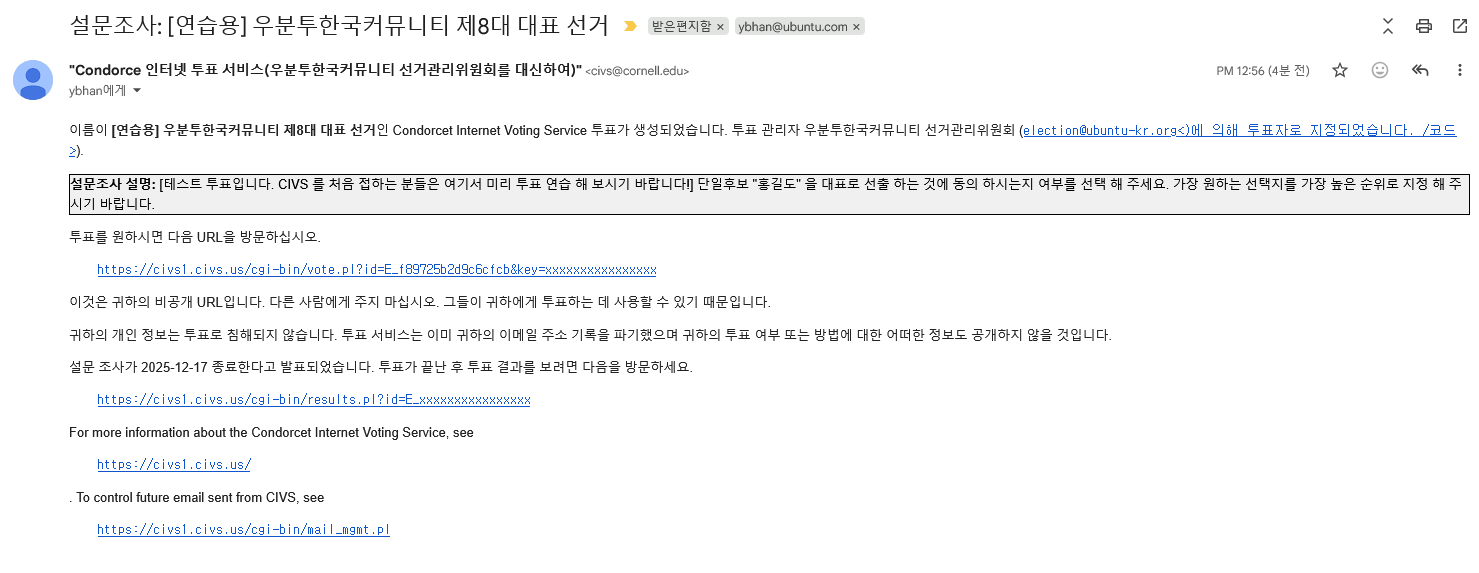 안녕하세요, 어느세 내일부터 투표 기간이 시작됩니다. CIVS 를 처음 사용 하시는 분들이 많으실 것으로 보여서, 연습 투표를 생성 하였습니다. 선거권(투표권)이 있는 분들은 아래와 같은 이메일이 발송 되었으니, 확인 하셔서 투표를 한번 연습 해 보시면 되겠습니다.