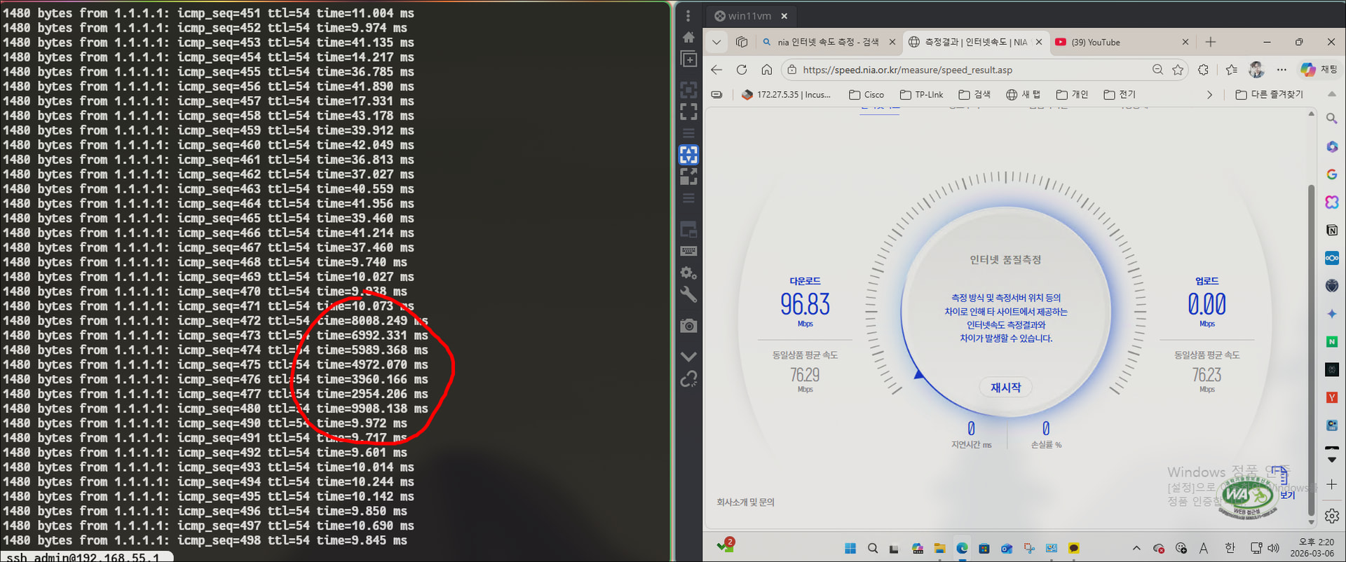 - 아래 그림은 속도 테스트 하며 Ping delay 현상 사진 입니다.