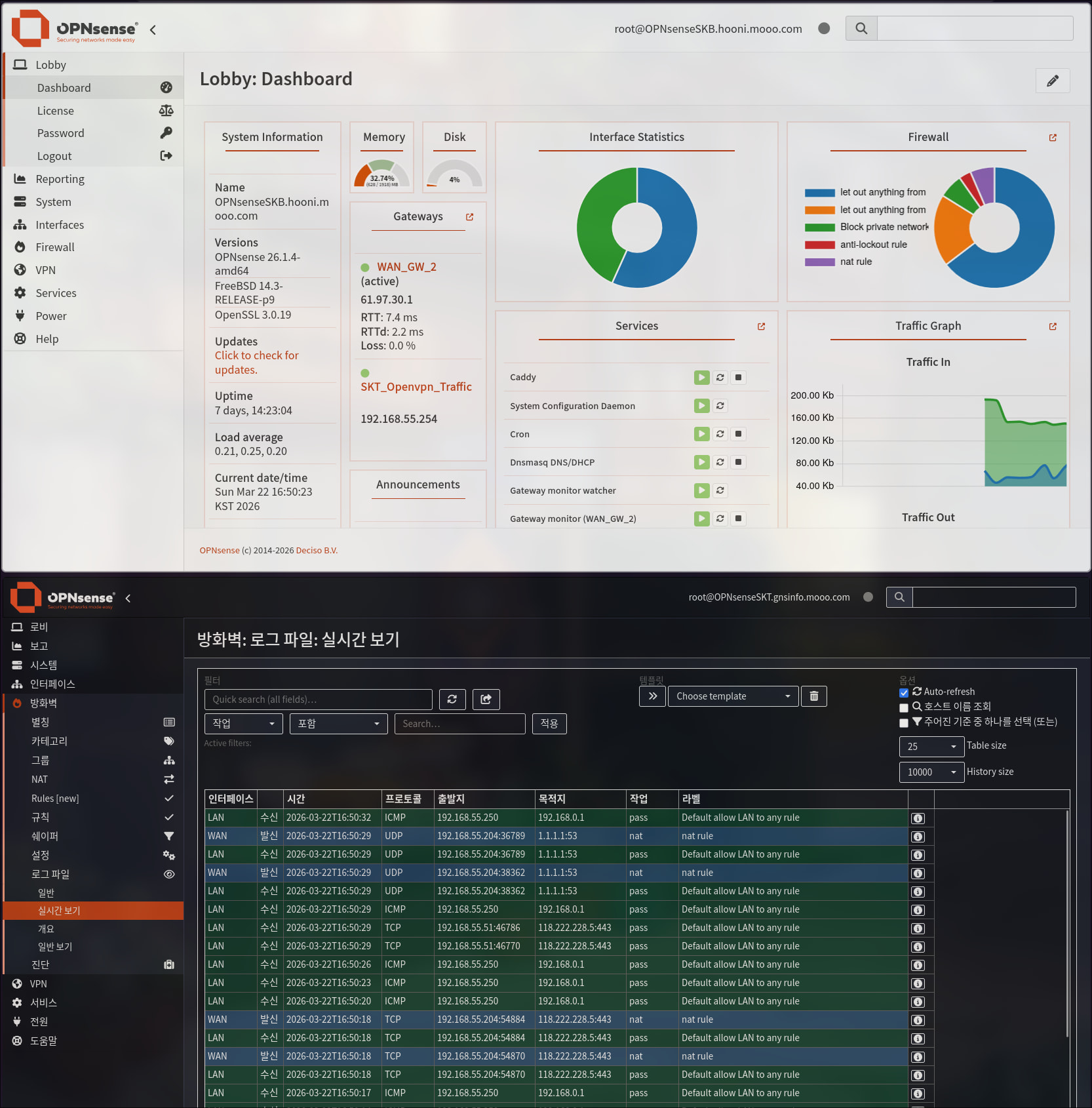 - 아래 그림은 OPNsense 데쉬보드와 실시간 로그 보기 입니다.
