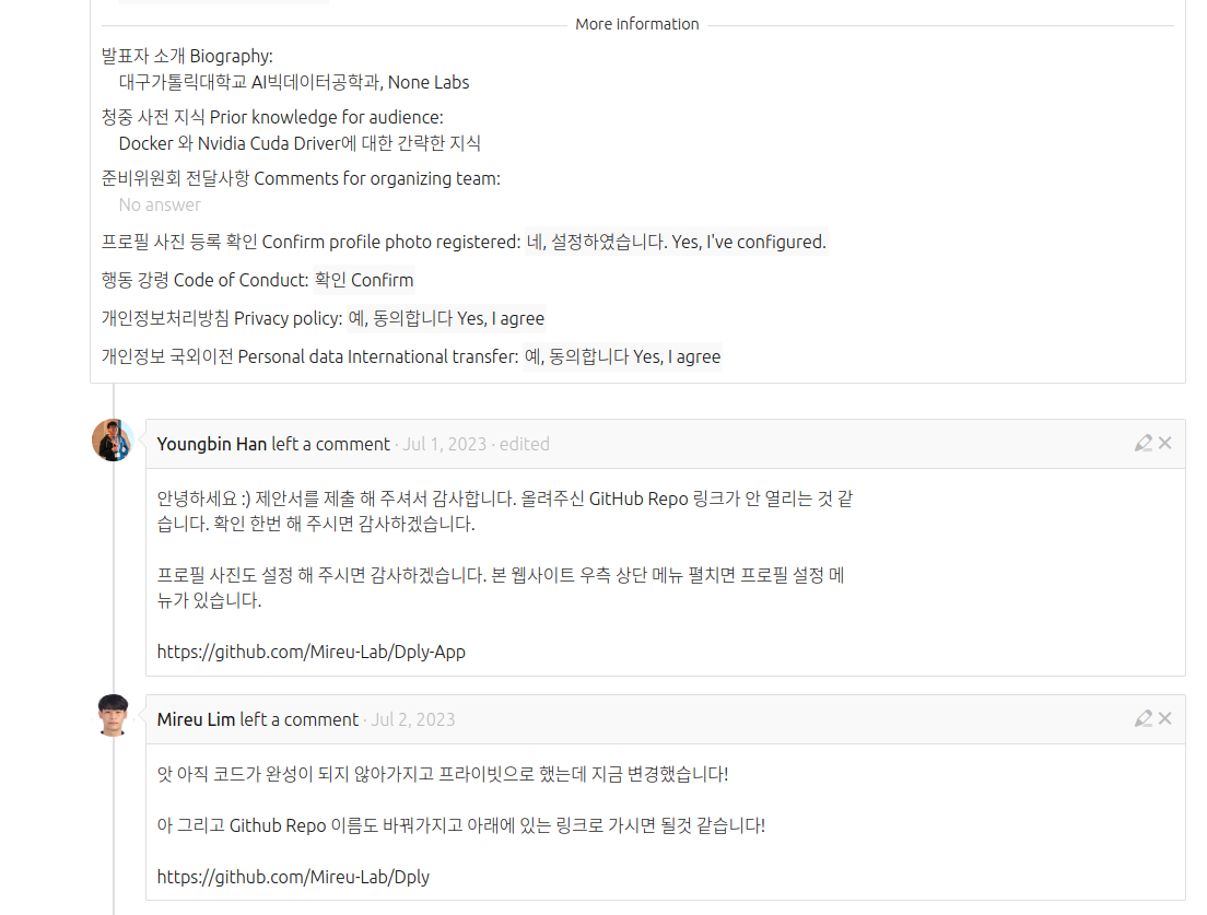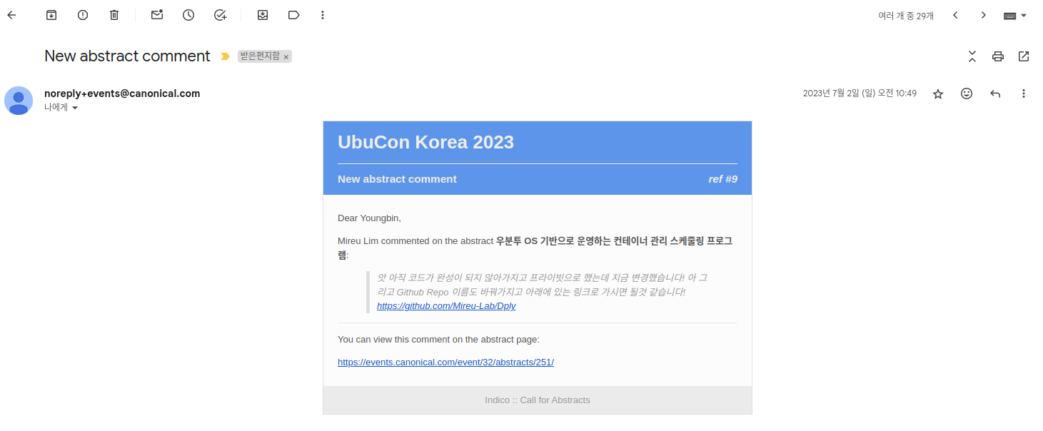 이메일로 알림이 오지 않는다면, 자주 Indico 를 확인 해 주시기를 권장 드립니다. 제안서를 제출하신 페이지 하단에 표시되는 제출된 본인의 제안서 목록에서, 각 항목을 클릭하면 나오는 제안서 상세 정보 화면이 나옵니다. 하단에 표시되는 댓글 영역에서 콘텐츠 팀과 의사소통이 가능하니 참고 해 주시면 되겠습니다.