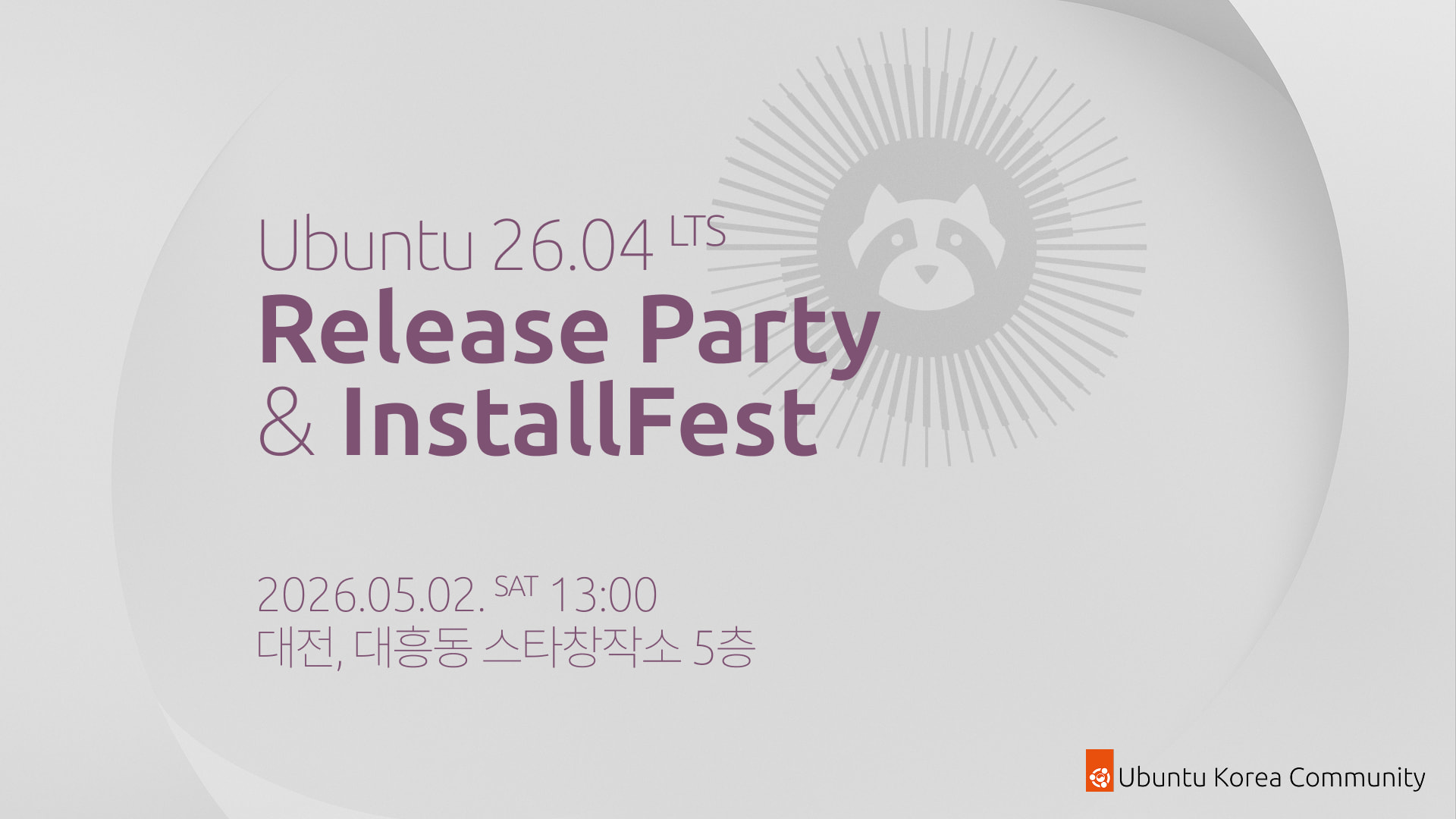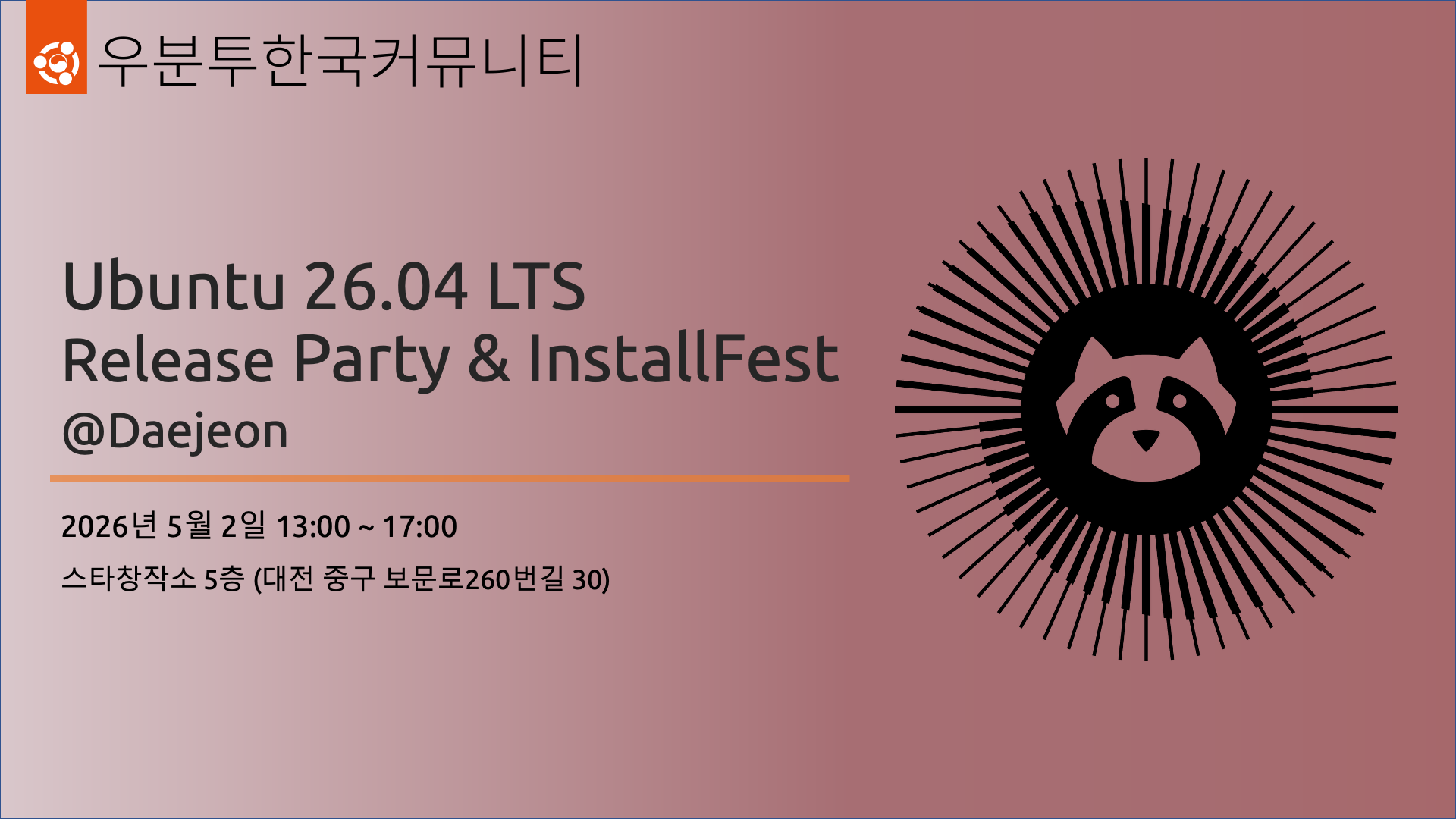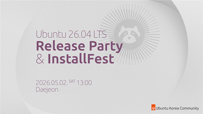우분투 26.04LTS 출시를 기념하여, 우분투한국커뮤니티에서 Ubuntu 26.04 LTS 릴리즈 파티가 열릴 예정입니다. 이번 행사는 그동안 정체되었던 대전 지역 행사를 다시금 활성화하고자 대전광역시에서 진행될 예정입니다. 무료로 등록 및 참석이 가능하니, 많은 참여 바랍니다!